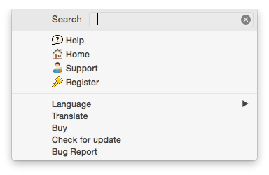 帮助 菜单上有 9 个选项: 帮助、主页、支持、注册、语言、翻译、购买、检查更新、错误报告.