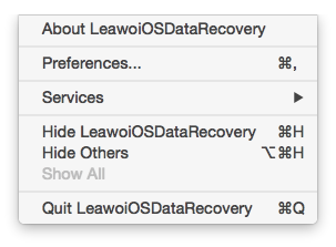 这个 LeawoiOS数据恢复 菜单有 7 个子选项: 关于我们 LeawoiOSDataRecovery、偏好设置、服务、隐藏 LeawoiOSDataRecovery,隐藏其他,显示全部,然后退出 LeawoiOS数据恢复.