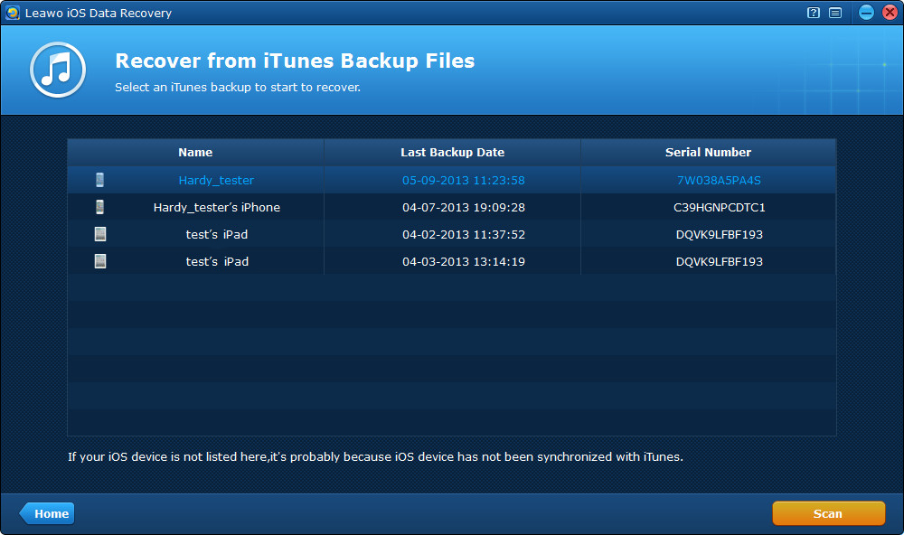 选择之后 从iTunes备份中恢复,您将看到使用 iTunes 备份的不同 iOS 设备的所有备份列表。如果您找不到设备的备份,可能是因为您尚未在此计算机上备份设备。