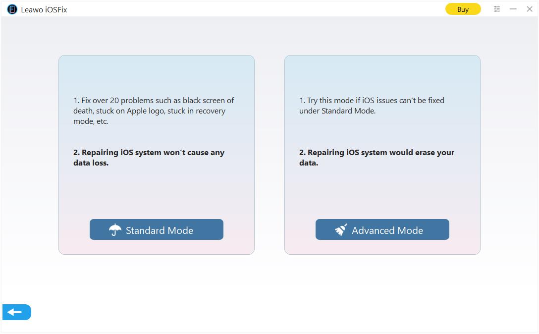 Leawo iOSFix 提供 2 种系统修复模式:标准模式和高级模式。标准模式提供无数据丢失解决方案来修复 iOS/tvOS 系统问题,而高级模式可彻底修复 iOS/tvOS 系统。您可以硬重置 iPhone 而不会丢失任何数据。