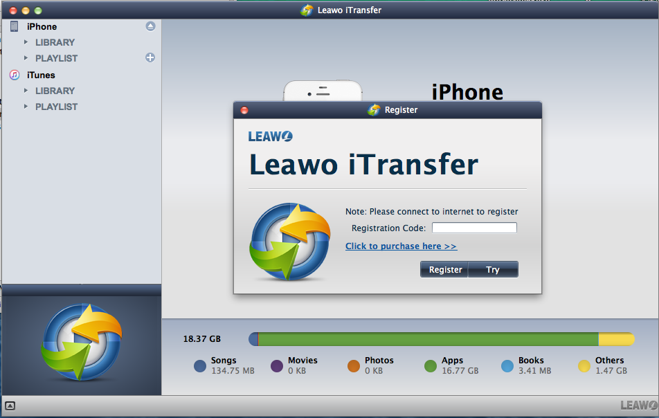 步骤 4。 正式上线 Leawo iTransfer 在 Mac 上,然后单击 “帮助 > 注册” 输入注册码并点击 “寄存器”