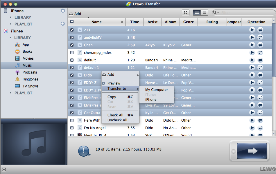 在 iTunes 的 LIBRARY 下,选择要传输的任意类型的文件。您可以使用 Command 键选择某些文件,然后右键单击所选文件以 “传输至 > iPhone”.