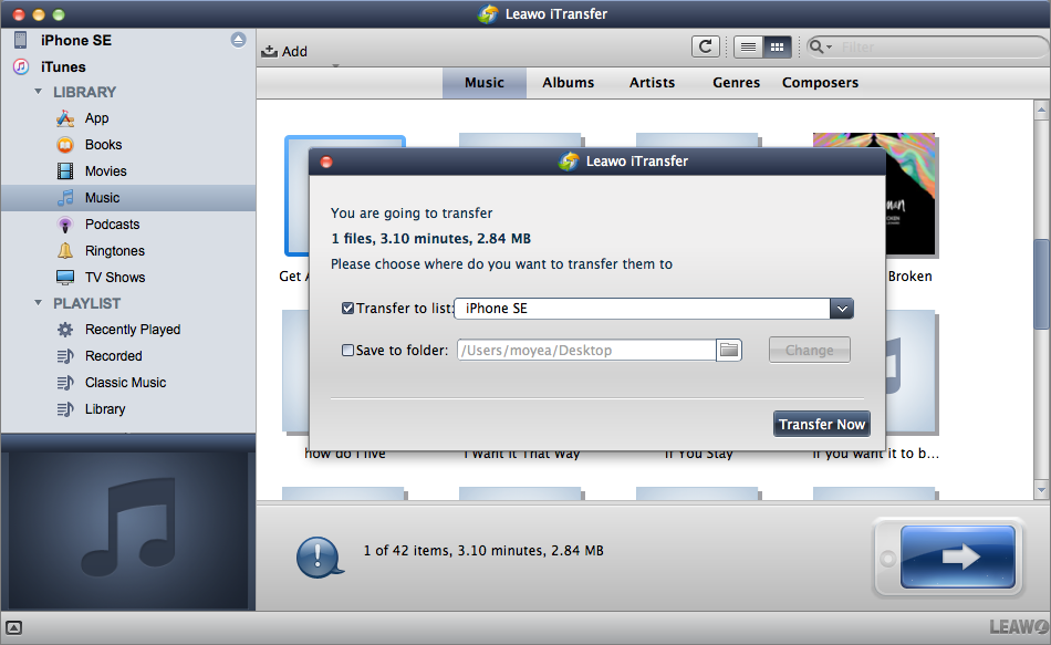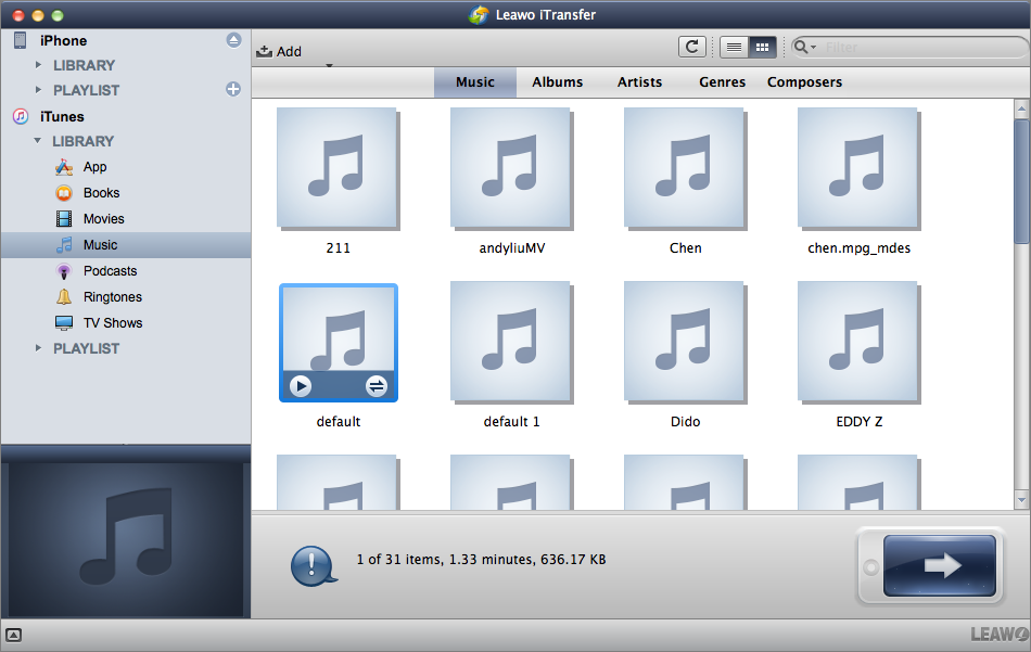 运行软件后,你会看到 iTunes 图书馆 与 PLAYLIST 在左侧边栏。然后使用 USB 线将 iPhone 连接到 Mac,软件将自动检测 iPhone。用户可以传输 应用程序、图书、电影、音乐、播客、铃声和 电视节目 从 iTunes 到 iPhone。
