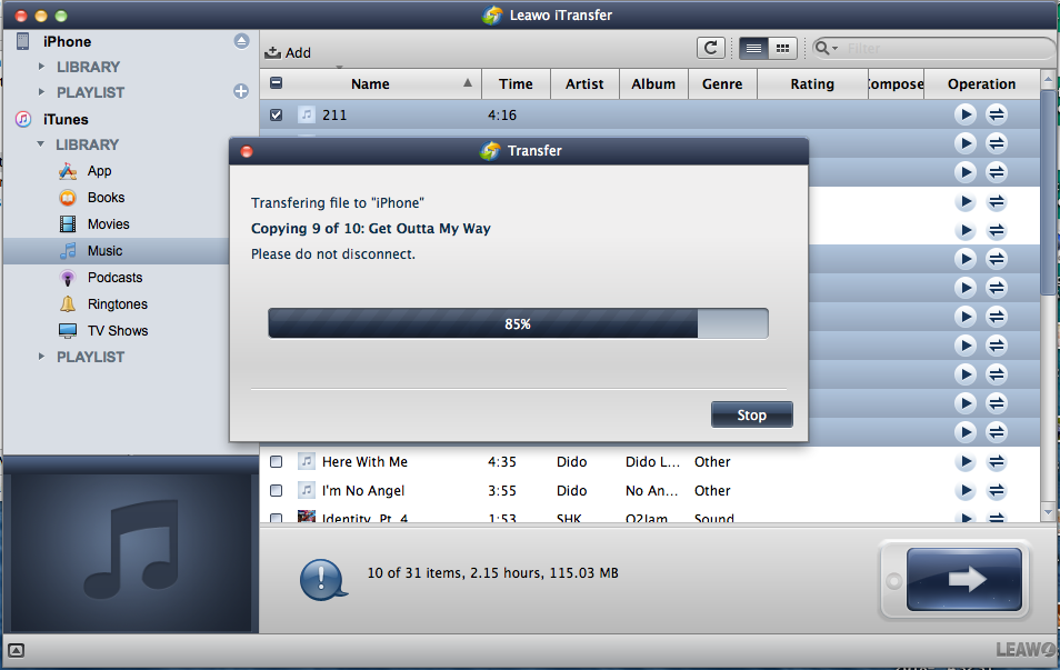 完成上述操作后,传输过程将开始,并弹出一个窗口向您显示传输过程。它将显示正在传输的文件的名称和数量。您可以点击 “停止”