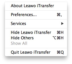 这个 “Leawo iTransfer= 菜单包括选项: “关于 Leawo iTransfer”、“偏好设置”、“服务”、“隐藏 Leawo iTransfer”、“隐藏其他”、“显示全部”“退出 Leawo iTransfer=.
