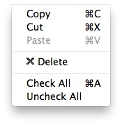 这个 “编辑” 菜单包括以下选项 “复制”、“剪切”、“粘贴”、“删除”、“全部选中”“取消全部选中”.