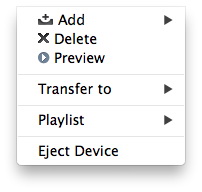 这个 “文件” 菜单包括选项: 添加、删除、预览、传输到、播放列表、弹出设备.