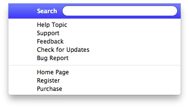 这个 帮助 菜单包括以下选项 “帮助主题”、“支持”、“反馈”、“检查更新”、“错误报告”、“主页”、“注册”“采购”.