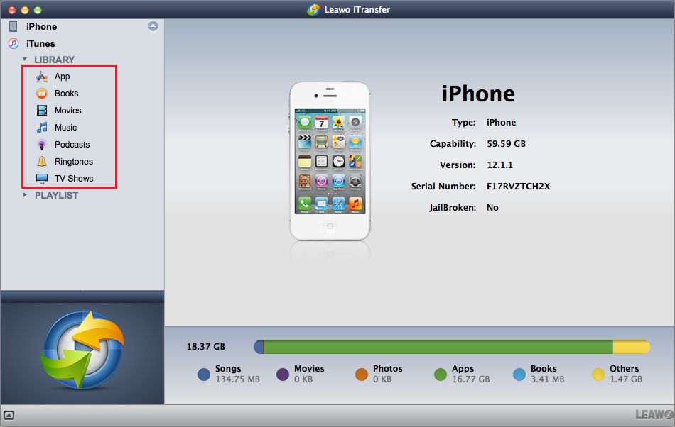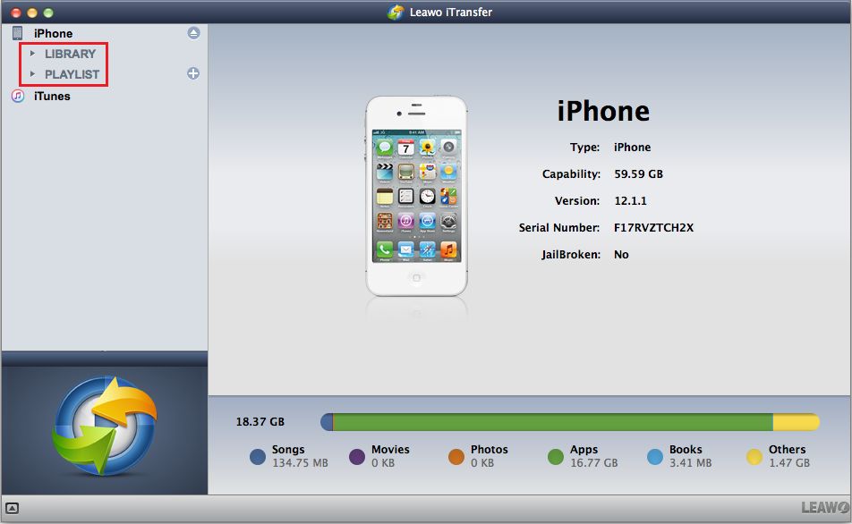 运行 Leawo iTransfer 适用于 Mac 并将 iOS 设备连接到 Mac。然后软件将自动检测您的设备,之后设备的详细信息将显示在主界面上。在左侧边栏中,单击 iOS 设备,然后单击 图书馆PLAYLIST 将显示设备的窗口,以便您管理 iOS 设备的文件。