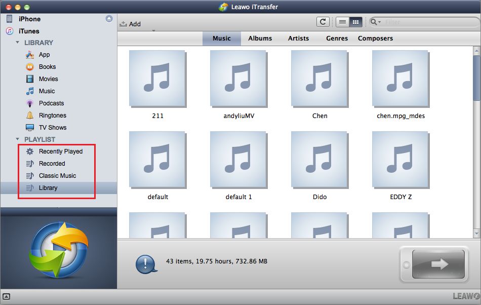 与iOS设备相同,您的iTunes文件将被软件自动扫描,然后单击 iTunes 在左侧边栏中,将显示 图书馆PLAYLIST 两个选项可供您管理 iTunes 文件。