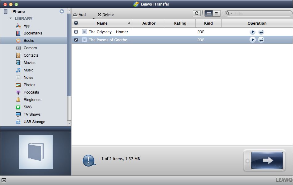 该传输软件允许用户无限制地传输应用程序、书签、电子书、相机胶卷、联系人、电影、笔记、照片、播客、铃声、短信、电视节目,即使这些文件不是从 iTunes Store 购买的。 Leawo iTransfer for Mac 可使数据传输快速稳定,大文件也可以轻松传输。