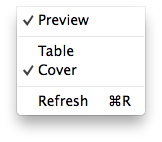四个选项 “预览”、“表格”、“封面”“刷新” 包括在此 “视图” 菜单。