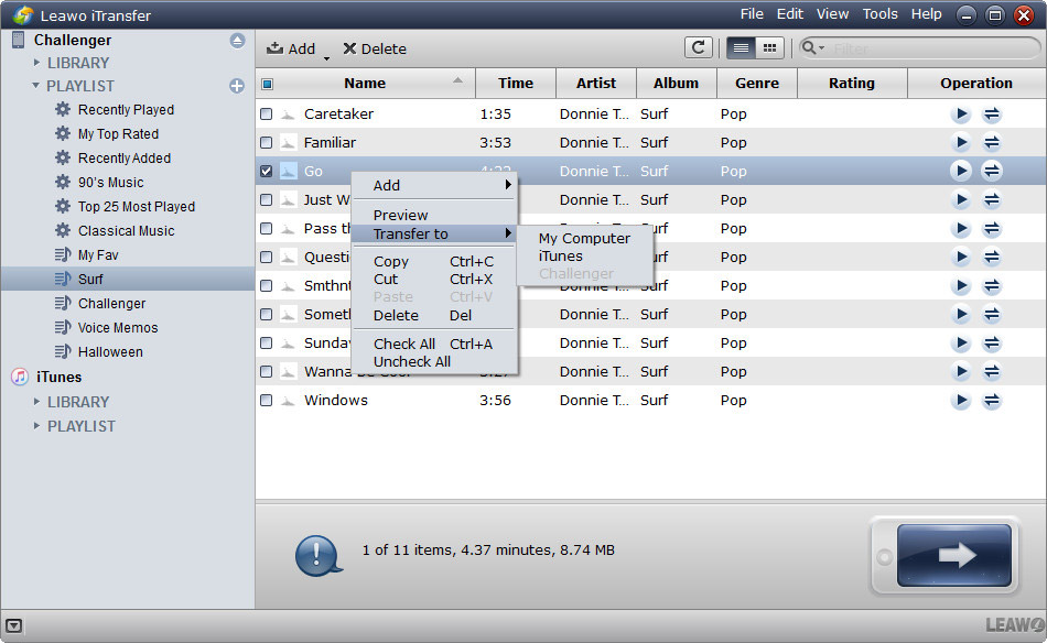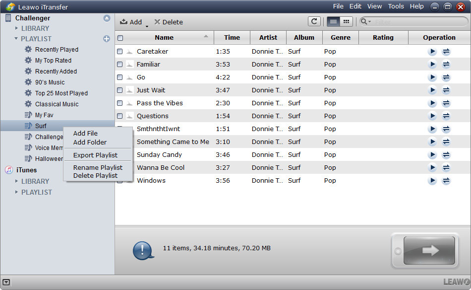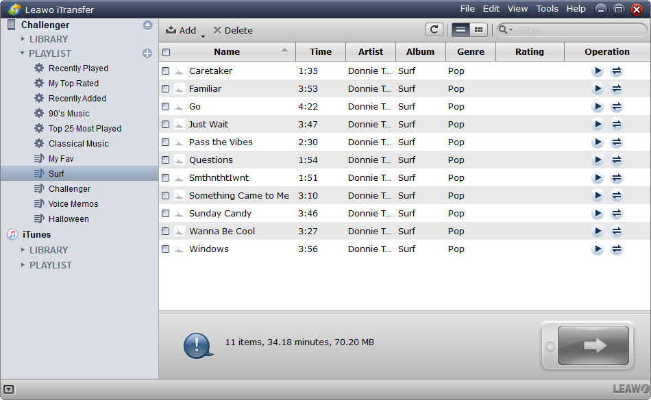 运行 Leawo iTransfer 然后用USB线将iPhone连接到电脑。软件将识别并检测iPhone。点击iPhone下的播放列表名称,然后选择要管理的播放列表。