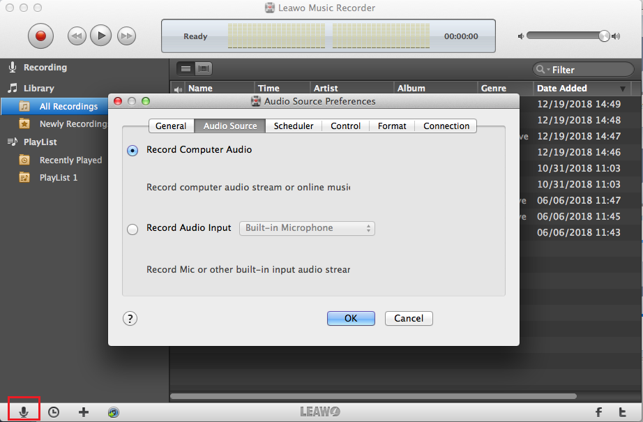 如果要录制来自不同音频源的音乐,请点击 “音源” 按钮获取。然后 音频源偏好设置 窗口会弹出并选择 录制计算机音频 录制计算机音频流或在线音乐,同时选择 录制音频输入 录制麦克风或其他内置音频流。