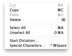 有 8 个选项 编辑 菜单包括 剪切、复制、粘贴、删除、全选/取消全选、开始听写特殊字符.