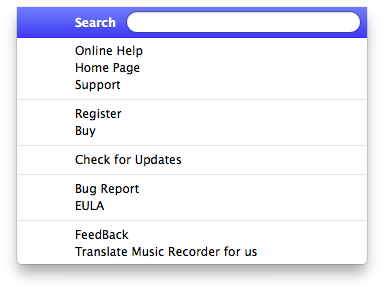 有 8 个选项可供选择 帮助 菜单: 在线帮助、主页、支持、注册、购买、检查更新、错误报告、最终用户许可协议、反馈和为我们翻译音乐录音机.