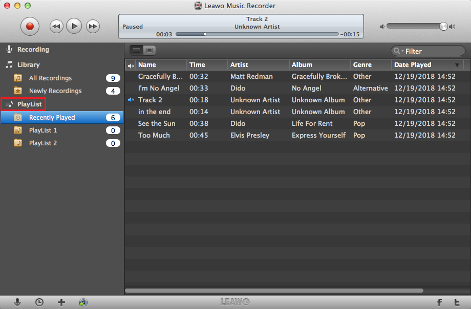您的所有播放列表都将放在 播放列表 选项。一般来说, “最近播放” 文件夹将放置刚刚播放的录音。但是,您可以创建一个新的播放列表,例如 播放列表 1.
