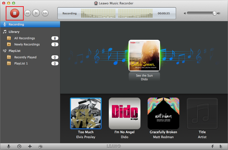 该软件支持录制计算机音频和在线音乐源,如 YouTube、AOL 音乐、Last.fm、Spotify 等。要录制音乐,只需单击红色的“开始” 按钮并播放要录制的音乐。录制完成后,单击同一按钮 停止录音