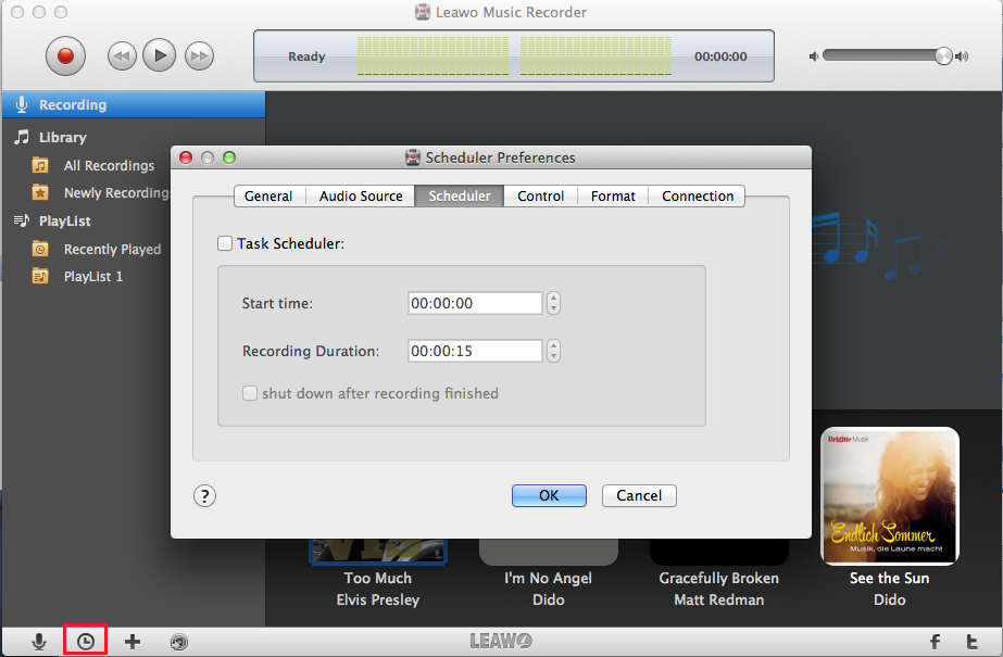 如果您想按计划录制,内置的录制任务计划程序可以帮助您。只需单击时钟 按钮,然后会弹出 调度程序首选项 窗口。然后投球 “任务计划程序” 选项并设置录音 开始时间录音时间.