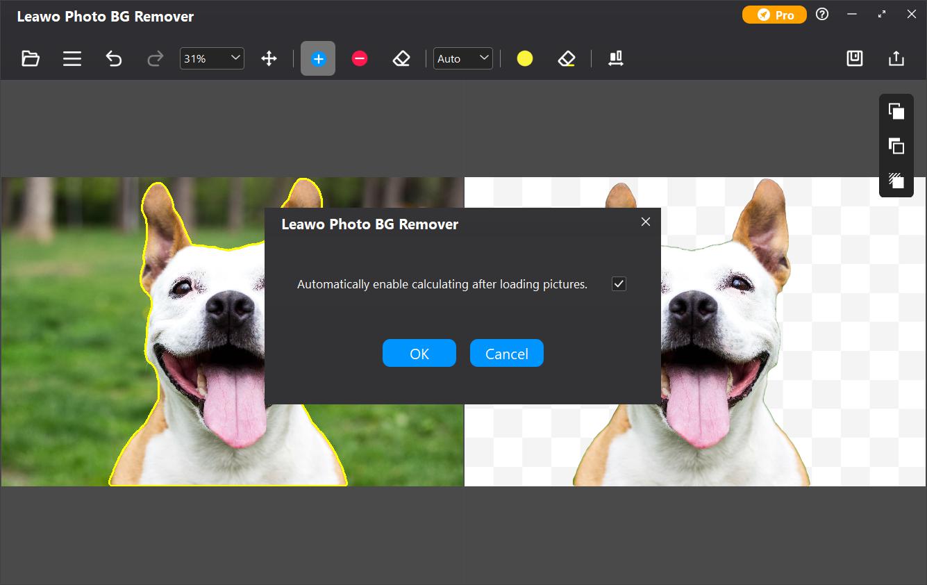 默认情况下,加载照片后会自动删除图片背景。要禁用此功能,您可以点击三栏图标 在顶部菜单栏中,选择“首选项”选项,取消勾选载入图片后的自动计算功能。如果对第一次计算结果不满意,可以点击“设置”按钮,选择“计算”选项,重新计算并重新封闭对象。
