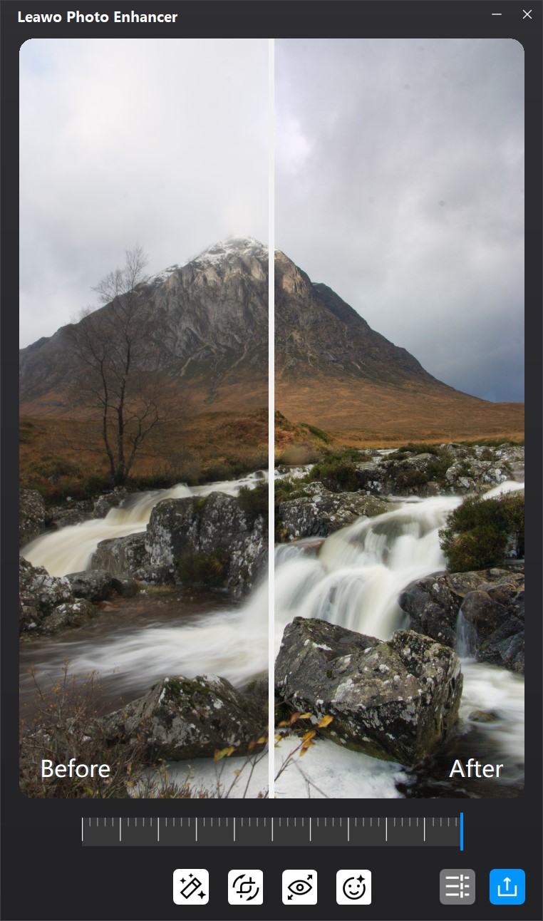 AI 照片增强完成后,在照片 AI 增强界面上,您可以获得即时预览器来查看照片 AI 增强器所涉及的“之前”和“之后”的照片效果。您可以自由拖动预览窗口上的滑块以获得大规模预览和即时比较。