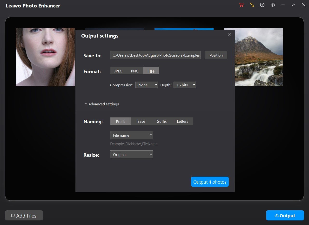 最后,在“输出设置”窗口中,单击蓝色的“输出photos”按钮输出 AI 增强照片。如果目标文件夹中有同名图片, Leawo 照片增强器将会注意到您。