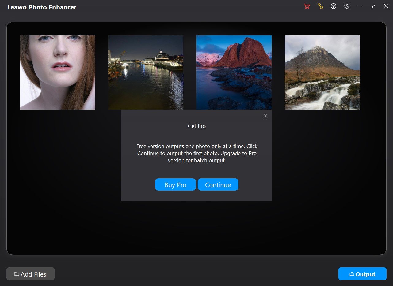 如果您正在使用免费试用版,您将看到一个“获取专业版”通知窗口,其中显示免费试用版的限制,并为您提供“购买专业版”和“继续”选项。您可以点击“购买专业版”选项购买专业版并注册 Leawo Photo Enhancer 体验其全部功能,或者点击“继续”按钮体验免费试用版。