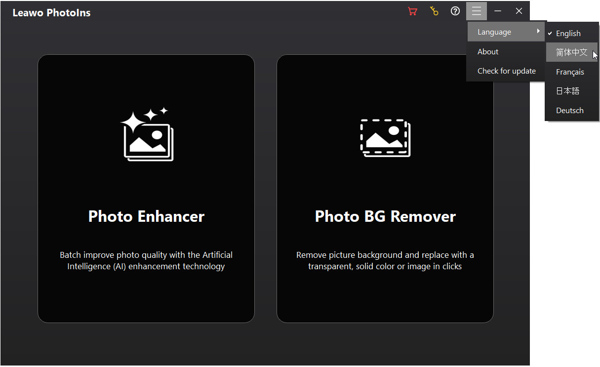 一旦你推出 Leawo PhotoIns 在计算机上,单击右上角的三条杠图标,然后导航到“语言”选项。多 UI 语言面板将弹出几种语言选项:简体中文(简体中文)、英语、法语(Français)、日语(日本語)和德语(Deutsch)。只需选择一种您喜欢的语言作为程序 UI 语言即可 Leawo PhotoIns.