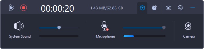 如果要在屏幕录制过程中启用或禁用“系统声音”、“麦克风”或“摄像头”,请点击设置按钮 ,然后单击每个功能的图标来启用或禁用相应的功能。