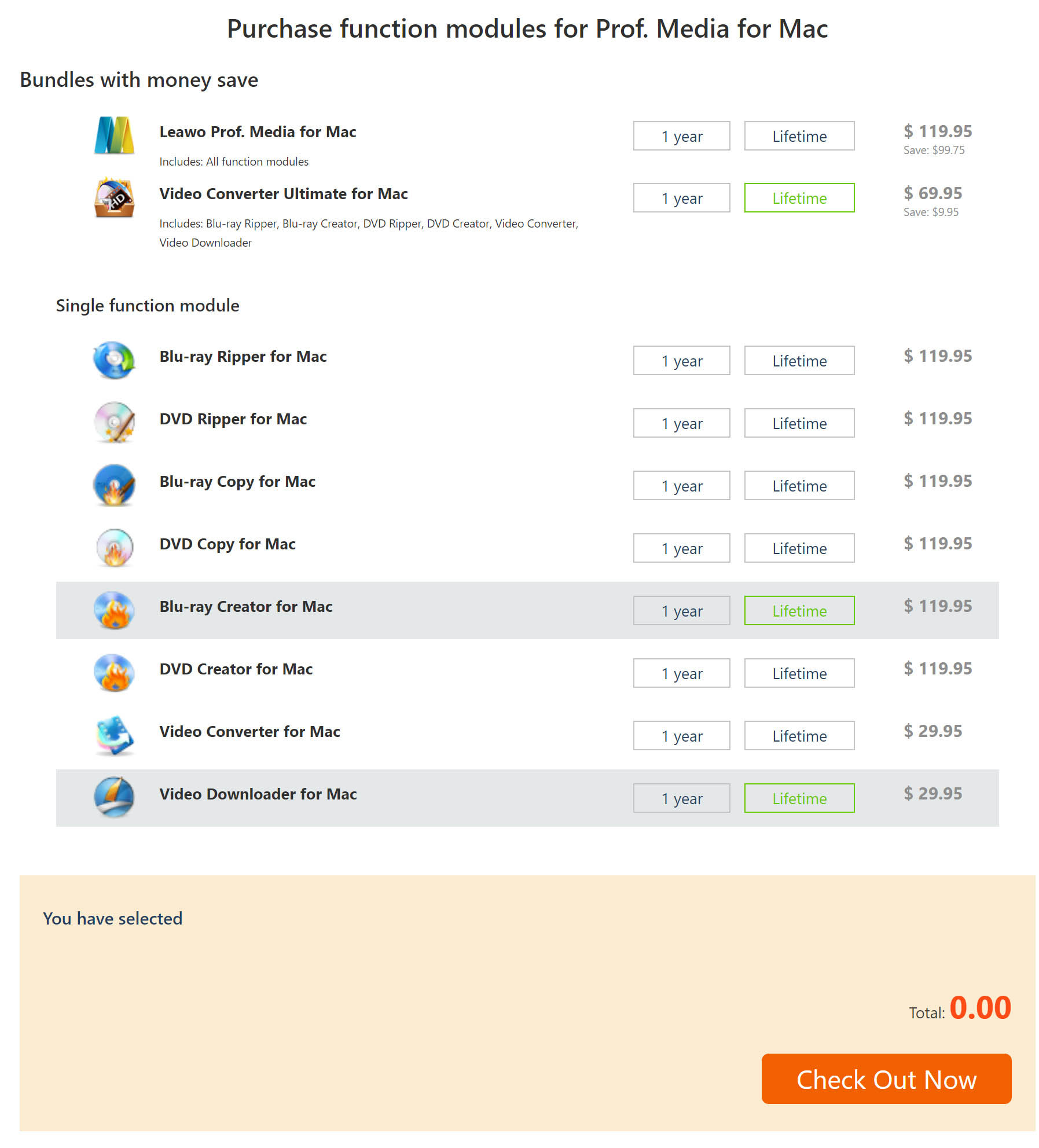 点击购买按钮之一,您将进入购买页面 Leawo Prof. Media. Leawo Prof. Media 总共包括8个不同的模组。如果您不想获得所有模组,您可以从下面的模组清单中选择您需要的模组。如果您想要所有模组,只需选择 Leawo Prof. Media 13 Mac 版本位于顶部。然后向下滚动并单击 立即结账 进入付款页面,输入注册码进行付款。
