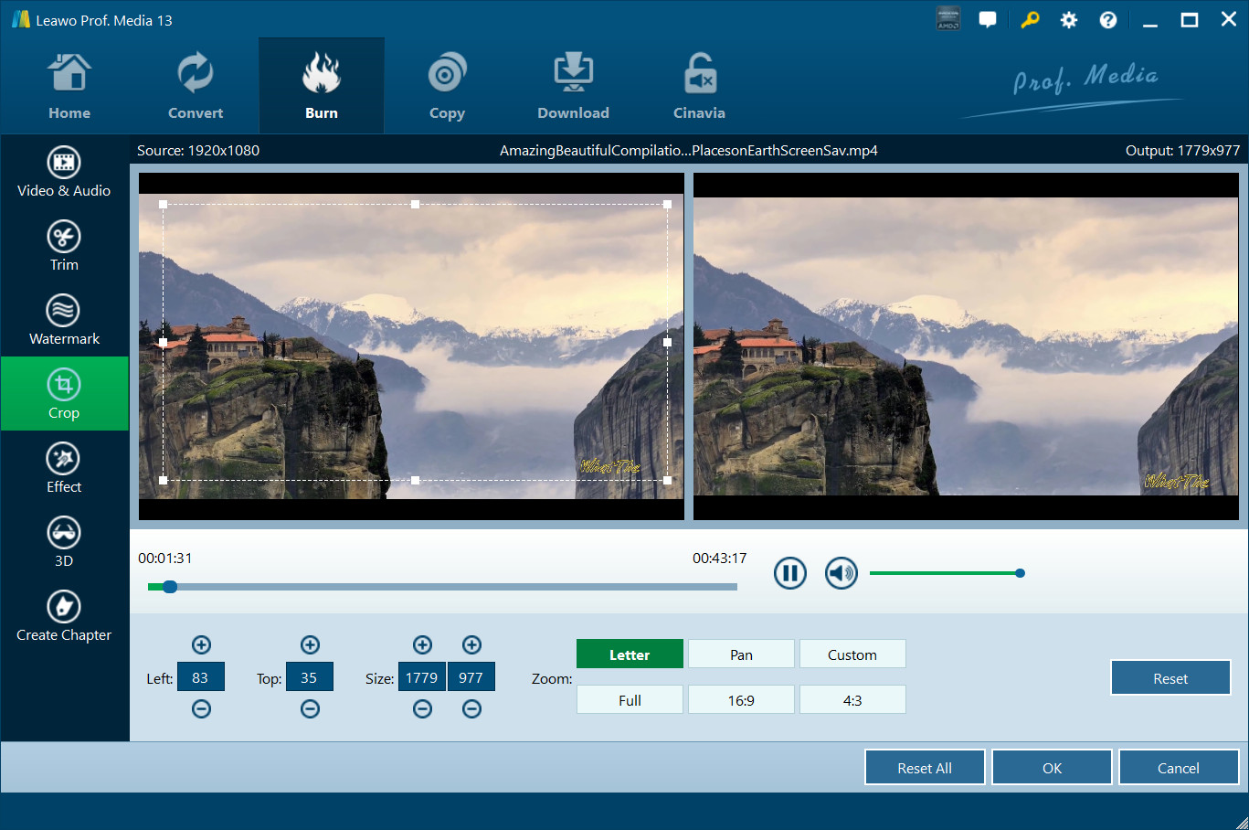 In 作物 选项卡,您可以首先选择一个 通过Zoom 样式,然后将框架的处理程序拖到左侧的“原始预览”窗口中,或者修改下面的参数以获得准确的结果来裁剪视频尺寸并删除黑边。