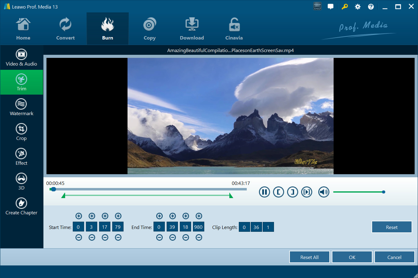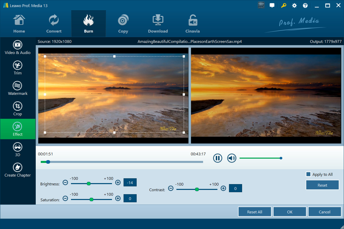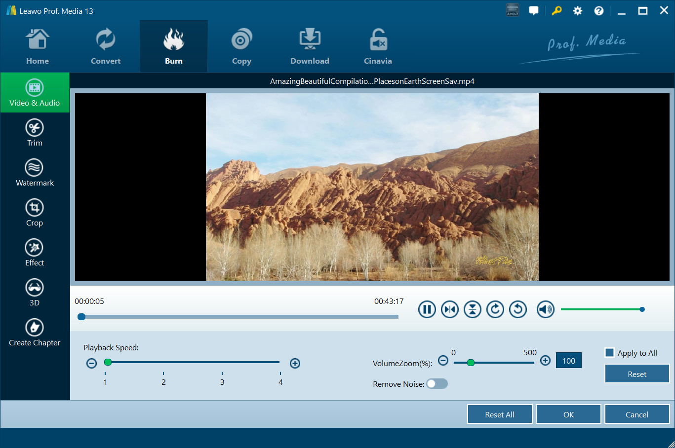 内部视频编辑器提供多种编辑功能,供您在获得最终输出之前编辑蓝光/DVD/视频文件。这些功能包括:视频和音频、修剪、水印、裁剪、效果、3D、创建章节等。 转化率 与 烧伤 模块为您提供视频编辑器。很容易进入编辑面板。在 转化率 模块,加载蓝光/DVD/视频文件后,点击 编辑 图标