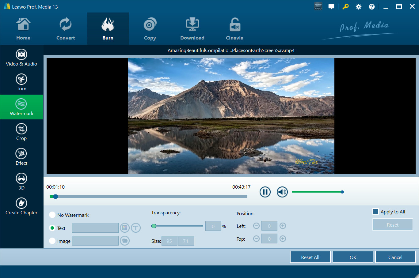 添加文字或图片水印后,可以调整水印 透明度、位置、大小,并选择是否将水印应用于全部。您也可以直接在“输出预览”面板上拖动添加的水印来设置水印位置。