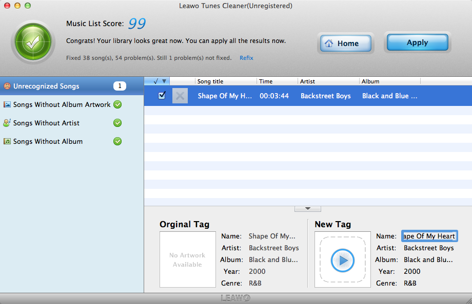 按钮应用修复结果。此外,您可以手动修复一些无法识别的歌曲。此外,如果您现在不想修复结果,只需选择 “编辑 > 保存项目” 在程序菜单中保存未修复的音乐文件以供下次修复。