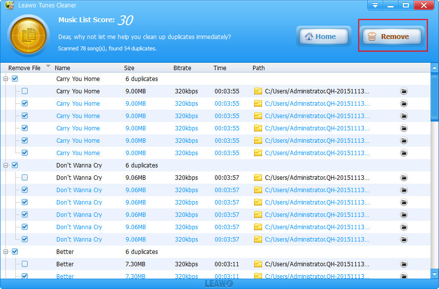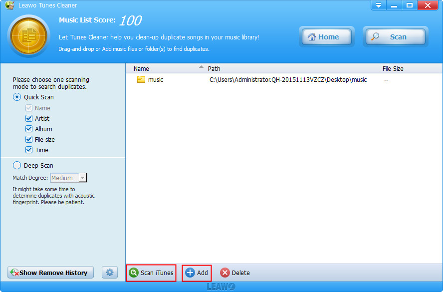 开球后 Leawo Tunes Cleaner 对于 Windows,单击 “清除重复项”