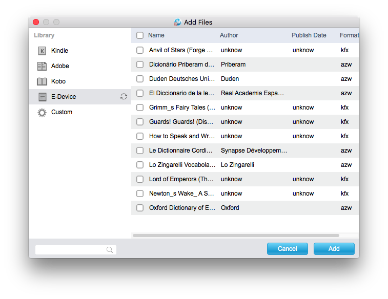 点击“添加文件”按钮后,您将在左侧栏看到“Kindle”按钮。只需点击刷新图标