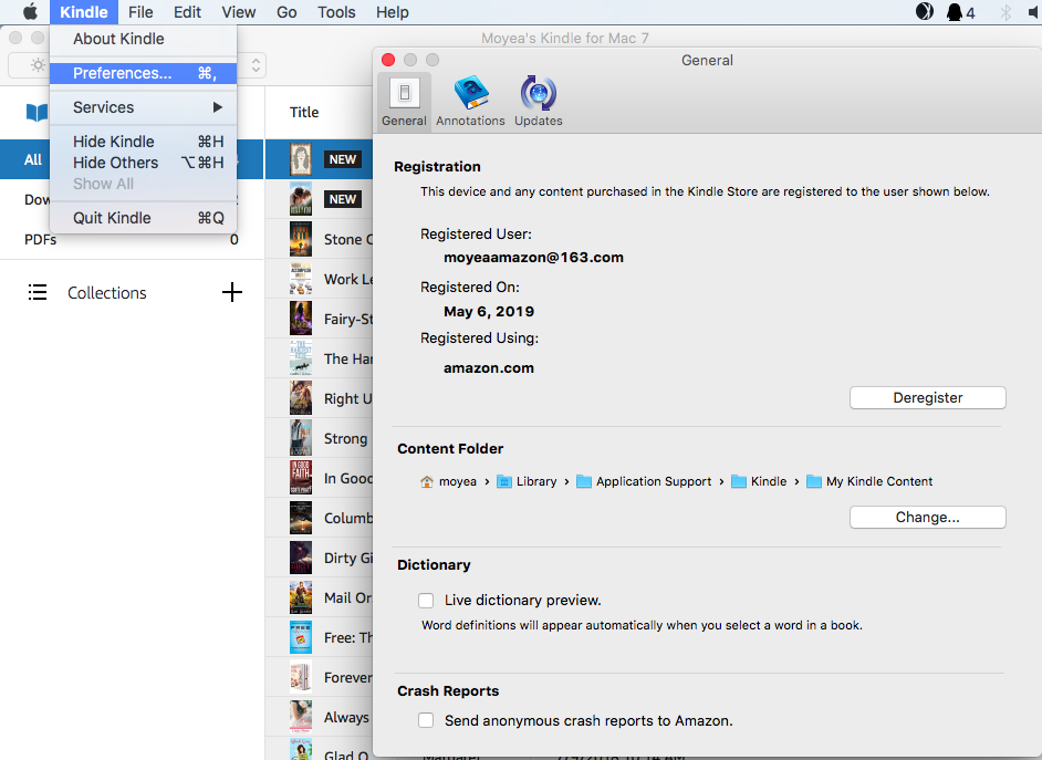 提示: 如果想准确找到已下载的书籍,可以进入“Kindle>偏好设置”,在新面板的“内容文件夹”中,可以看到已下载的目录。