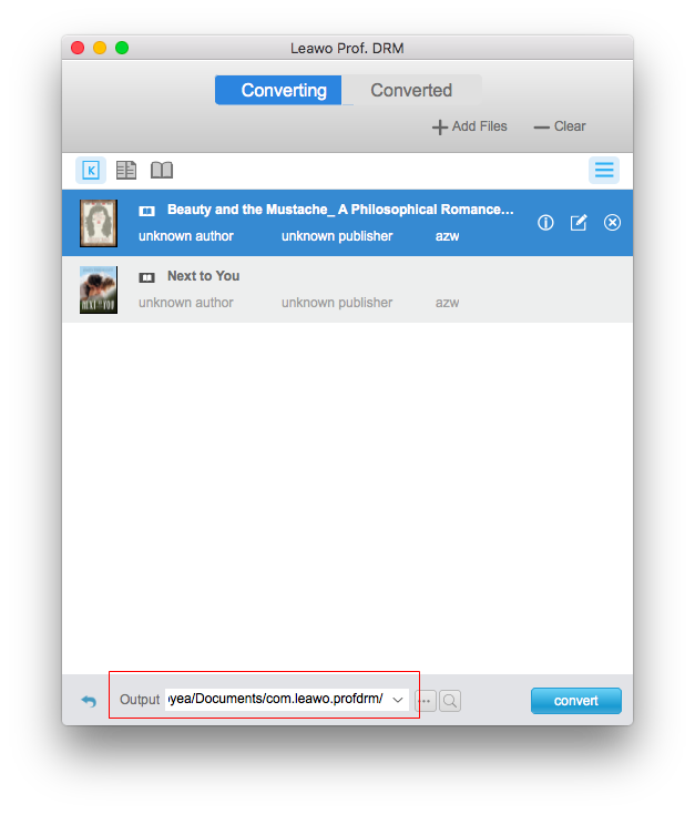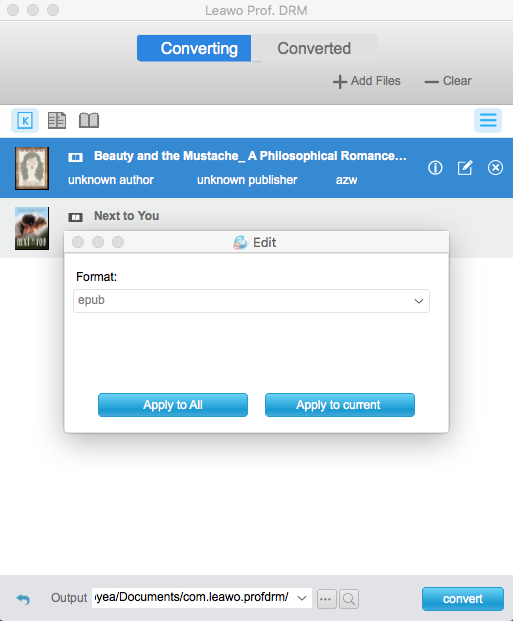 Leawo Prof. DRM Mac 版还可以用作电子书转换器,从 Kindle 中下载的数字书籍中删除 AZW DRM,然后转换为无 DRM 格式,如 epub、mobi、azw3、txt 等,以打破特定电子书 APP 和设备的限制。使用 Prof. DRM 电子书转换器,使用该程序时您不仅可以享受 50 倍的转换速度,还可以享受 100% 的原始质量。