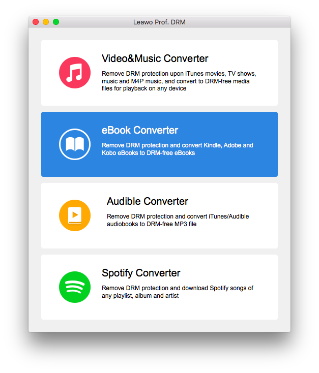 跑完后 Leawo Prof. DRM 对于 Mac,请选择 eBook DRM Remover 将您的 Kindle 文件导入程序。由于 DRM 保护的类型不同,请确保您已进入正确的模块。