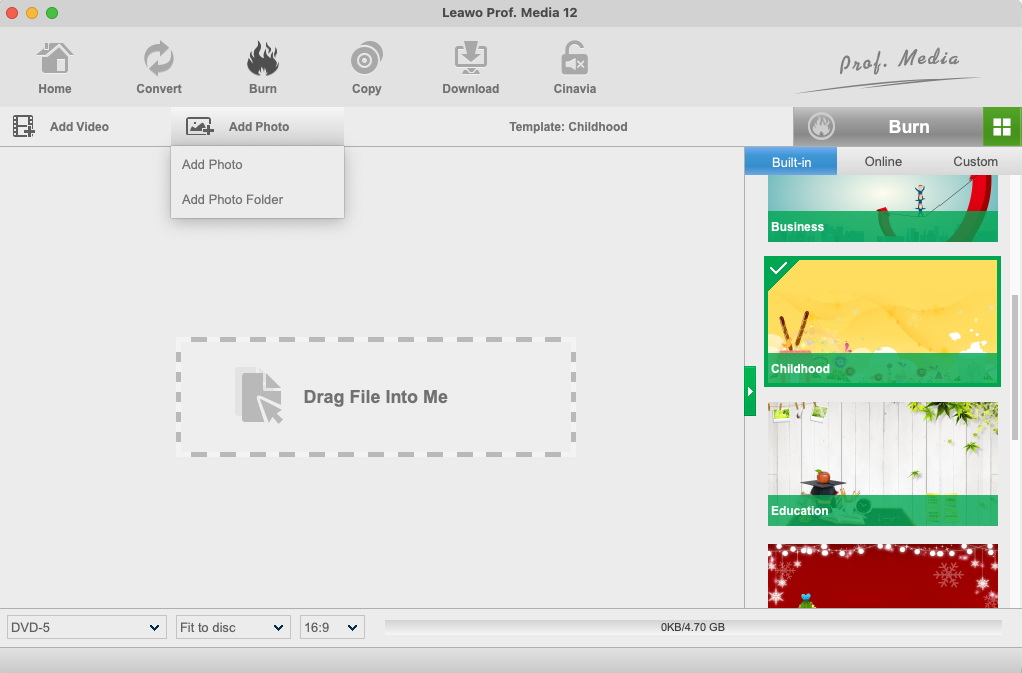 打开“刻录”模块,然后单击“添加照片”按钮,浏览并添加要转换为幻灯片并刻录到 DVD 的照片。加载后,选定的照片将自动生成照片幻灯片。单击缩略图图标可播放生成的照片幻灯片。您可以在程序底部设置输出光盘类型、质量和宽高比。