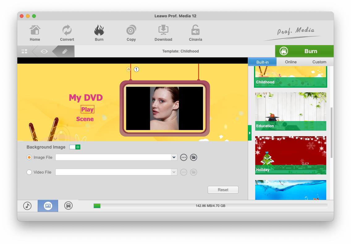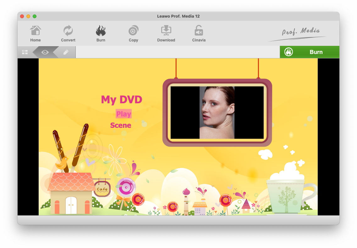 您还可以使用此程序设计光盘菜单。从右侧栏中选择一个光盘菜单模板,然后单击所选光盘菜单的中间进行预览。