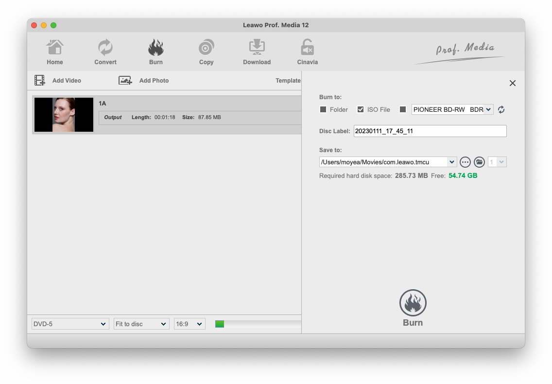 点击绿色的“刻录”按钮弹出侧边栏。在弹出的侧边栏上,设置“刻录到”、“光盘标签”和“保存到”选项。完成这些后,点击底部的“刻录”按钮开始将生成的照片幻灯片刻录到 DVD。