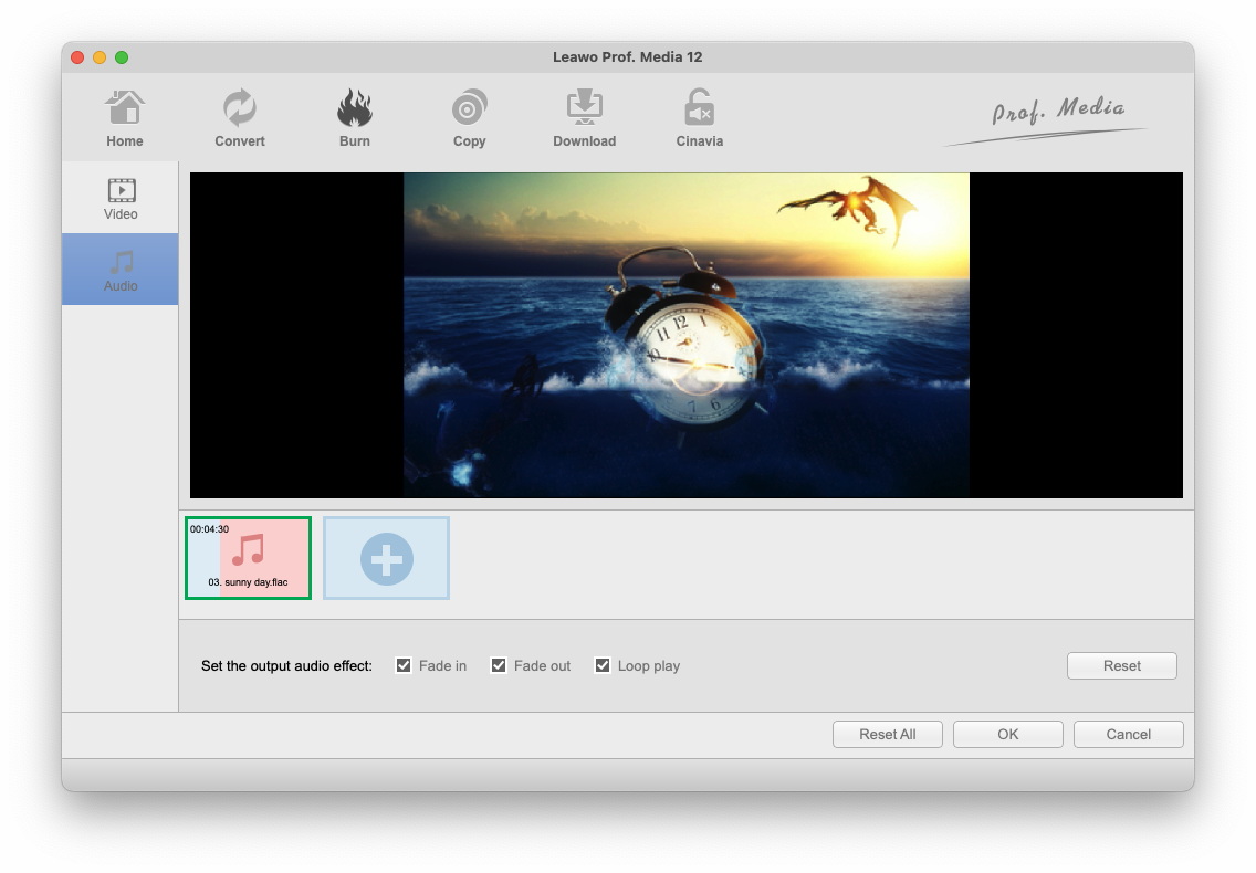 您可以拖拽一首或几首歌曲作为背景音乐,改变音乐位置以及调整输出音频效果。
