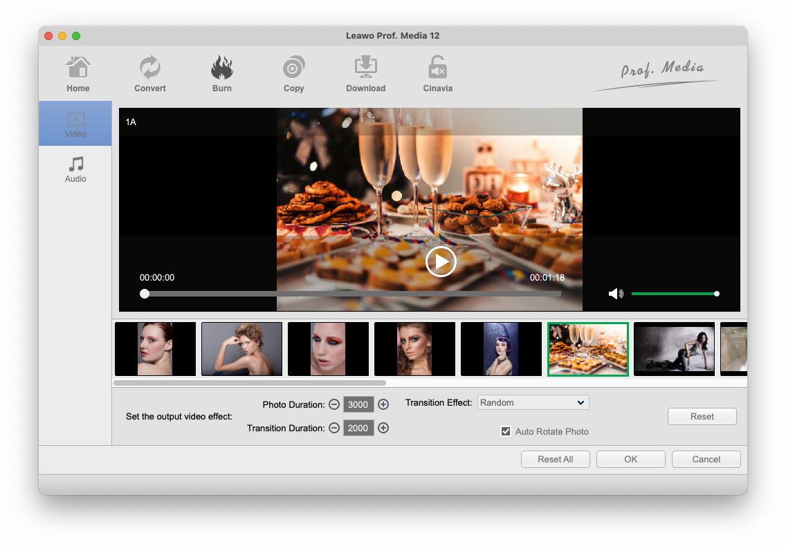 在编辑面板上打开“视频”面板。您可以通过拖放调整照片位置、在幻灯片中添加额外照片、设置照片时长、过渡时间和过渡效果等。您可以通过内置播放器即时预览。