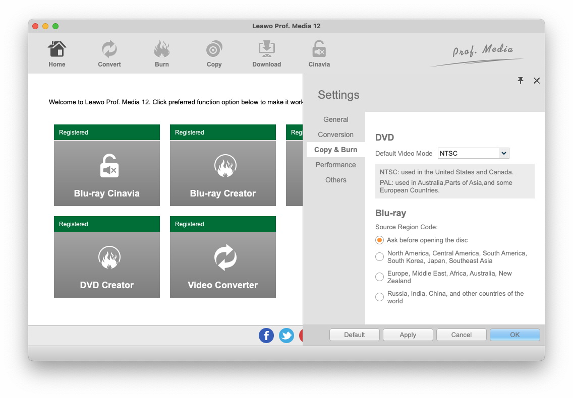 在“复制和刻录”按钮下,您可以根据自己的需要选择默认的 DVD 视频模式。