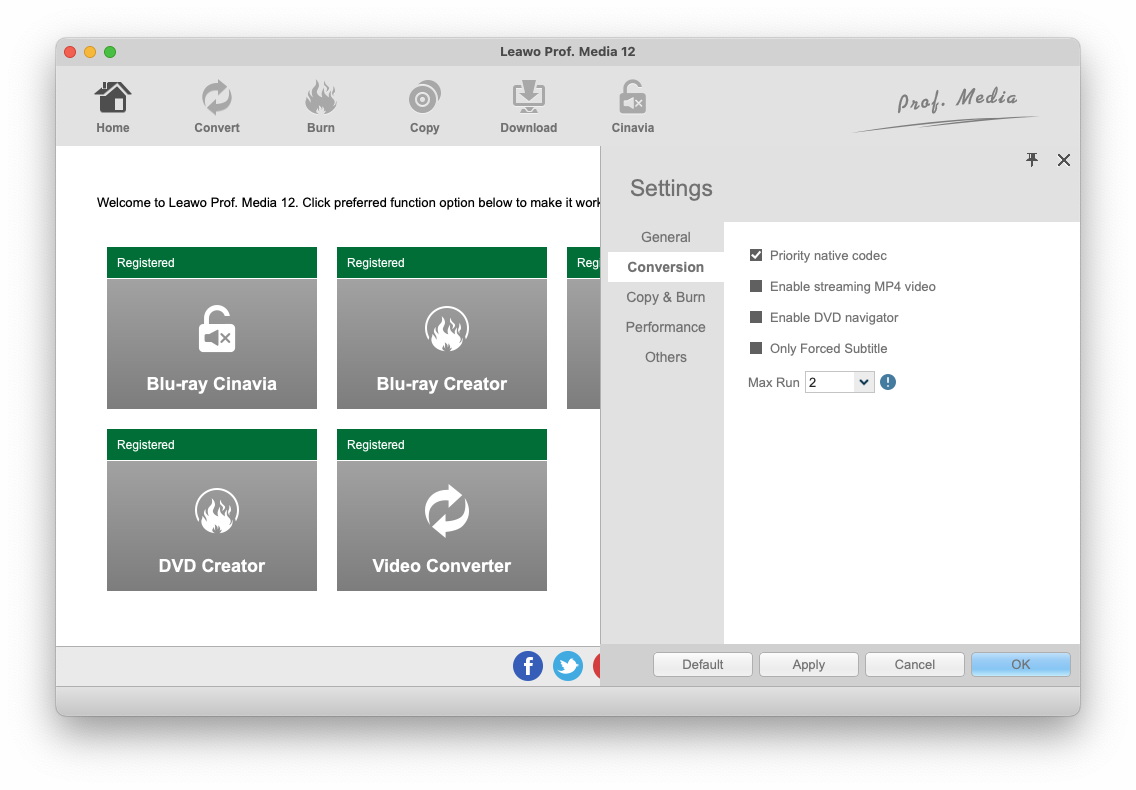 在“转换”按钮下,您可以选择是否优先使用本机编解码器、是否启用流式 MP4 视频以及是否启用 DVD 导航器,同时您可以设置运行的最大任务数。