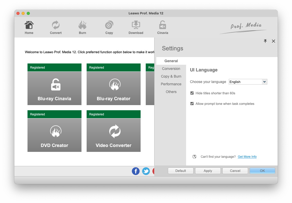 点击 ”Leawo程序顶部的“VideoConverterUltimate”按钮弹出面板,点击“首选项”进入设置模块。