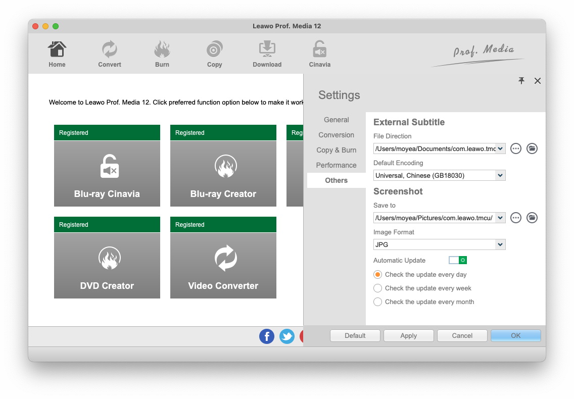 点击程序顶部的“帮助”按钮,弹出面板,点击“激活”即可注册并激活程序 Leawo 视频转换器终极版,点击“购买”购买并注册程序,点击“主页”访问 Leawo 视频转换器终极版,点击“教程”学习如何正确使用 Leawo Prof. Media,点击“支持”获取支持 Leawo 软件团队,点击“Bug Report”报告您在使用过程中遇到的问题 Leawo 视频转换器终极版,点击“反馈”将您宝贵的反馈发送至 Leawo 用于改进该程序的软件,点击“Rate It”可以撰写用户对该程序的评价,点击“Check Update”可以检查程序更新。