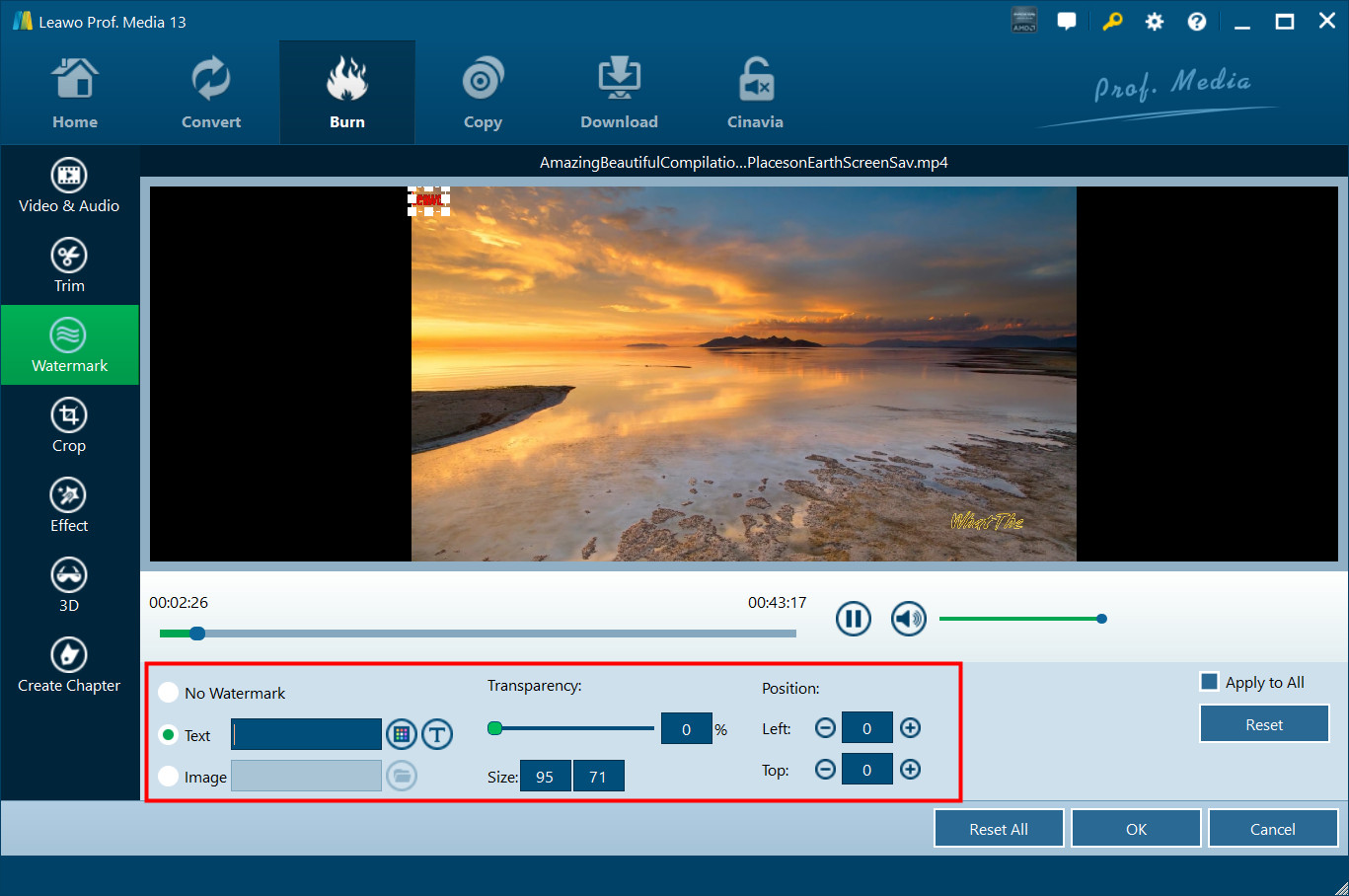 切换到“水印”部分,将水印按钮设为绿色,然后您就可以添加文本或图像作为视频水印。水印透明度、左边距、上边距、图像大小均可调整。勾选“应用于全部”可将水印添加到所有视频。按“确定”确认。