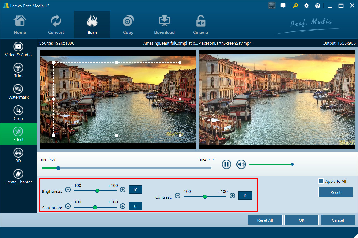 转到“效果”部分,直接拖动“亮度”、“对比度”、“饱和度”的幻灯片以获得特殊视频效果。选中“应用于全部”以将效果设置应用于任何加载的文件。按“确定”确认。
